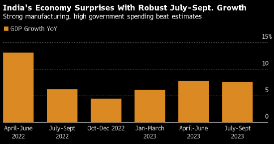据周四公布的政府数据,截至9月的三个月国内生产总值同比增长7.6%,高于对经济学家调查中的所有预估。这一数据也大幅高于印度央行6.5%的预期。