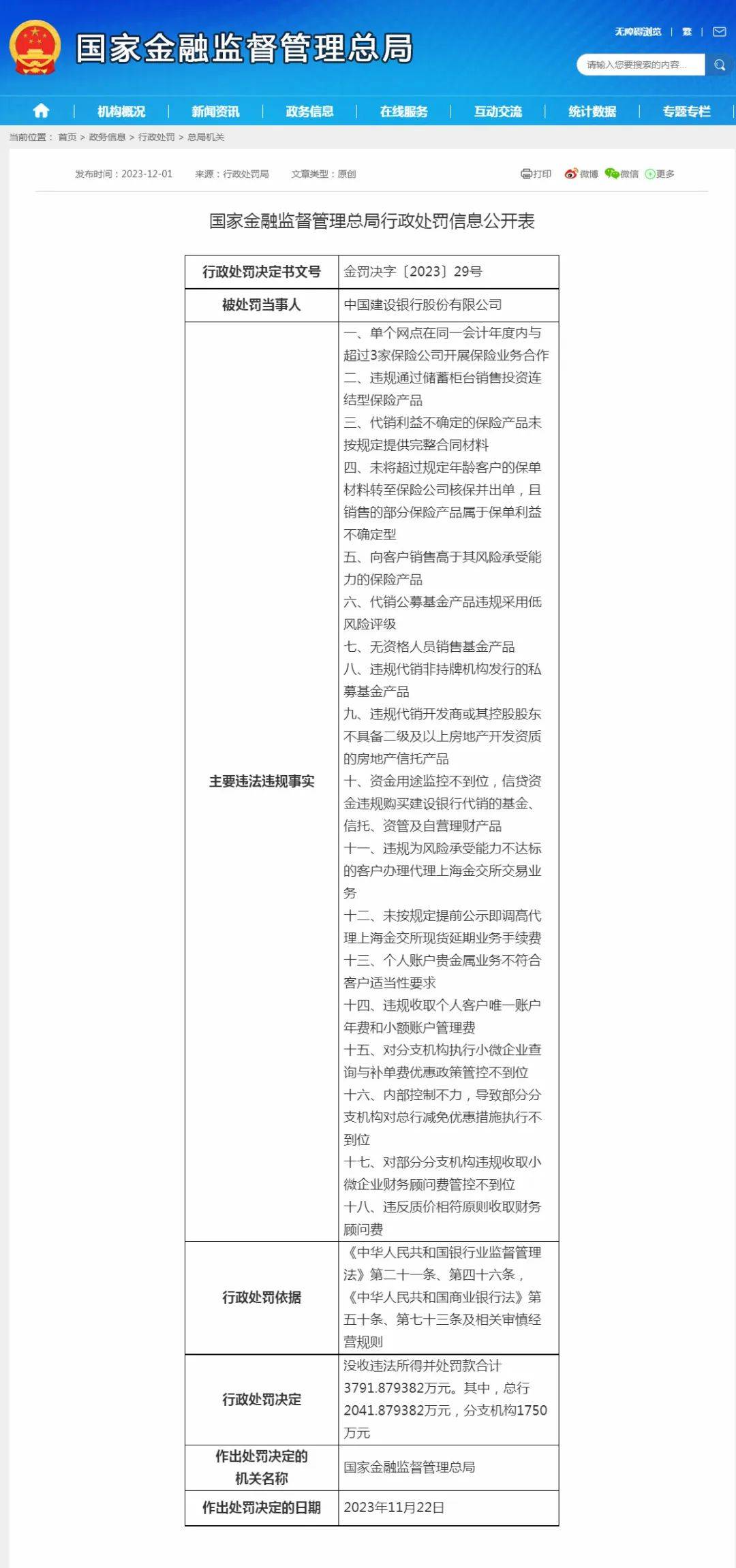 没收违法所得并处罚款合计3791.879382万元。其中,总行2041.879382万元,分支机构1750万元。