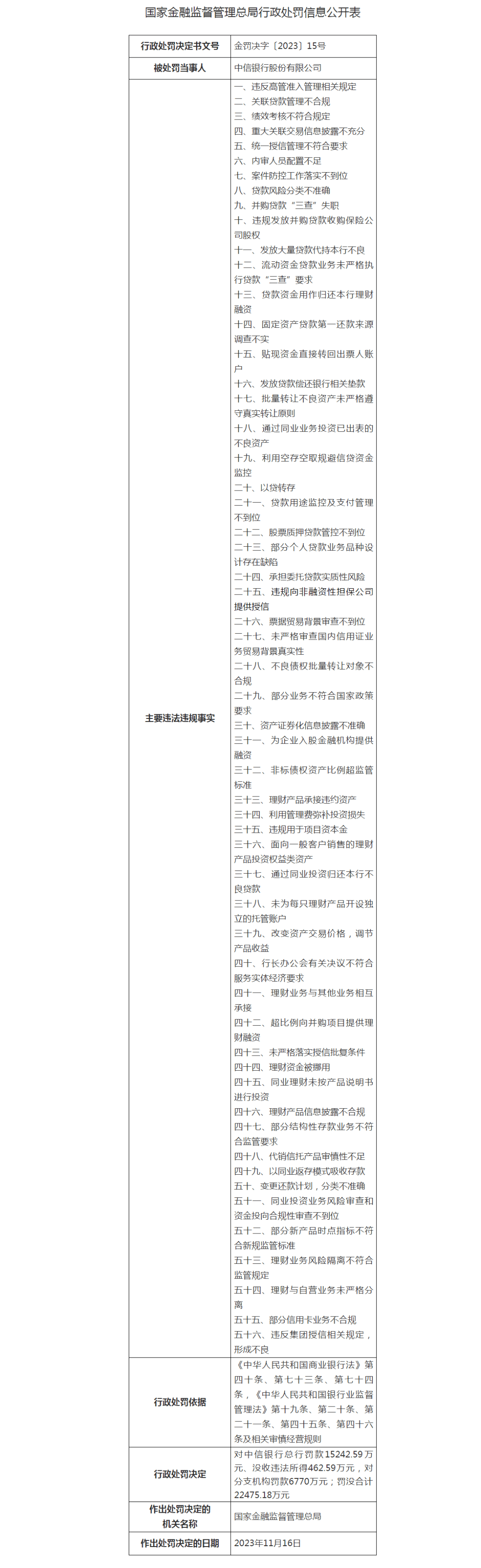 据国家金融监督管理总局网站12月1日发布,中信银行股份有限公司、中国农业银行股份有限公司、中国建设银行股份有限公司被处罚。其中中信银行股份有限公司因涉及56项违法违规事实,被罚没合计22475.18万元。