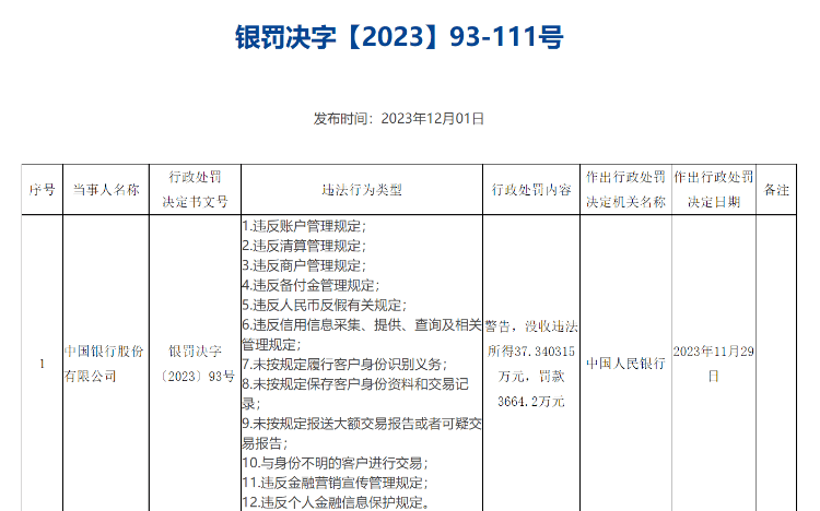 12月1日,中国人民银行行政处罚公示显示,央行对中国银行处以警告,没收违法所得37.34万元,罚款3664.2万元,因违反账户管理规定、违反清算管理规定、违反商户管理规定等12项违法行为类型。