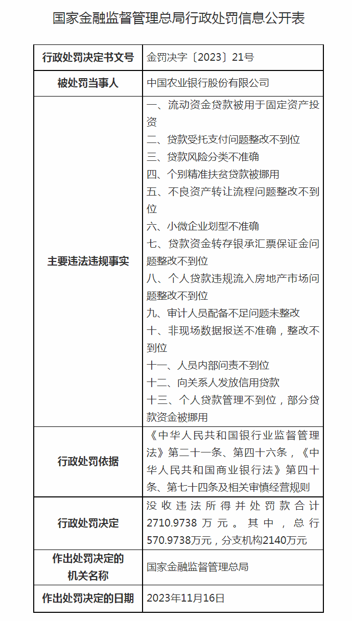 没收违法所得并处罚款合计2710.9738万元。其中,总行570.9738万元,分支机构2140万元。
