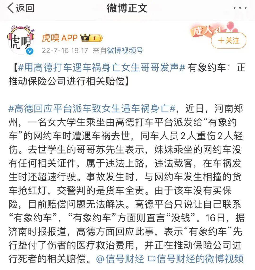 上述案件由于货车全责且无保险,高德打车和有象约车给予的解决方案并不能让家属认可,所以被公布于微博上。