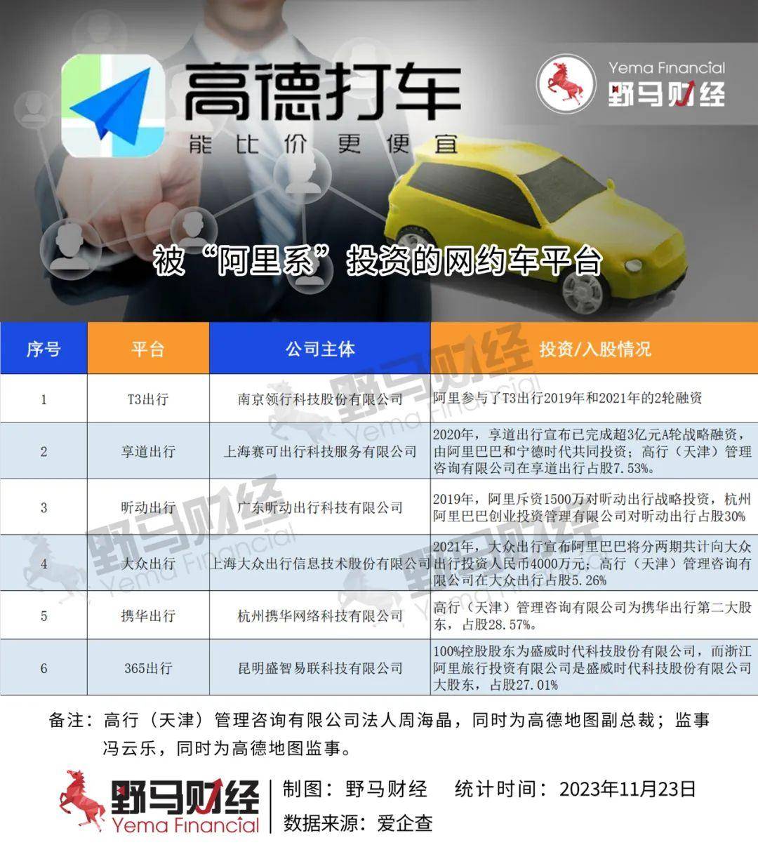 除了股权质押关系之外,高德打车合作的T3出行曾经在2019年和2021年进行了2轮融资,阿里均有参与;2019年,阿里还斥资1500万对昕动出行战略投资;2020年,阿里与宁德时代共同参与了享道出行的A轮融资,合计投资3亿元;2021年,阿里又斥资4000万元参投了大众出行。此外,阿里旗下的浙江阿里旅行投资公司,还是365出行母公司盛威时代的大股东,占股27.01%。