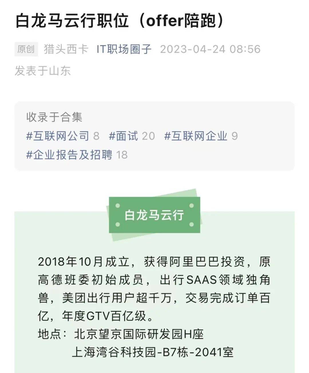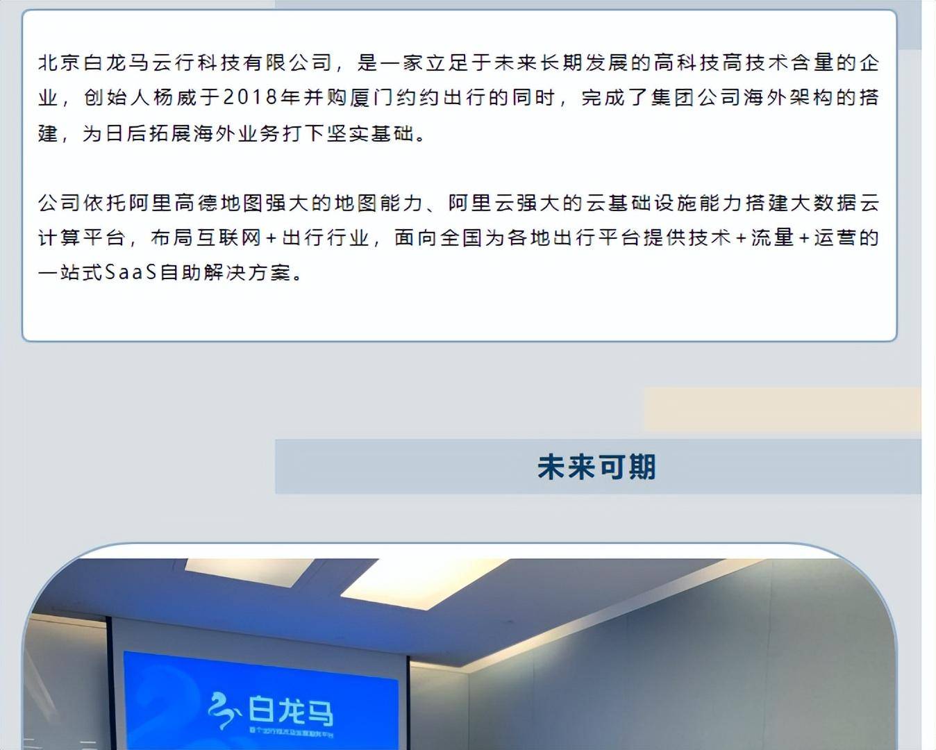 而并购约约出行的究竟是谁呢?则是上述三家SaaS服务商之一的白龙马。据白龙马入驻望京国际研发园的宣发资料可见:白龙马创始人杨威于2018年并购厦门约约出行。公司依托阿里高德地图强大的地图能力、阿里云强大的云基础设施能力搭建大数据云计算平台,布局互联网+出行行业。