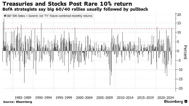 随着交易员对美联储已经完成加息的信心增强,股票和债券上个月同步上涨,标准普尔500指数和10年期美国国债合计上涨了12%。历史数据显示,在过去的40年里,美国股票和债券的月回报率只有10次达到或超过12%。