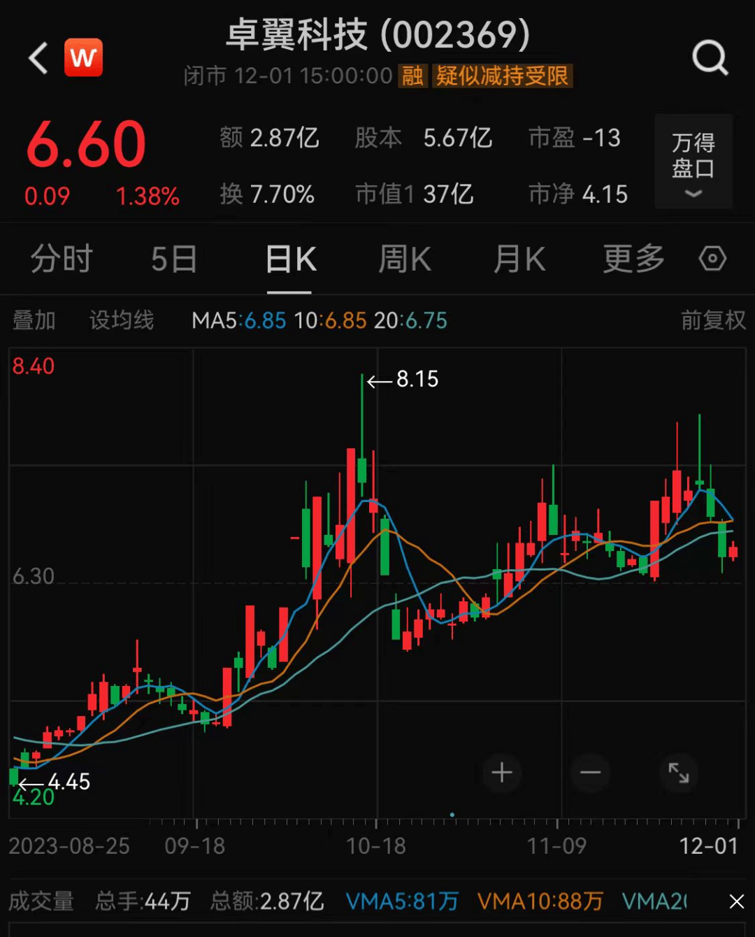 12月1日收盘,卓翼科技每股报6.6元,年内增幅近40%,最新市值37亿元。