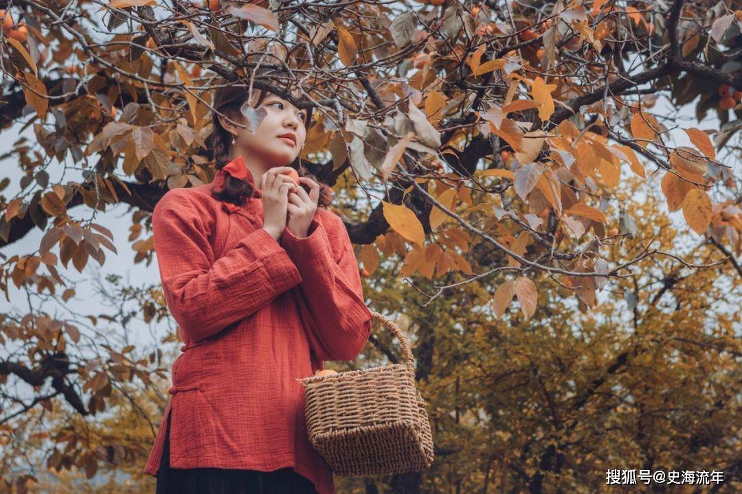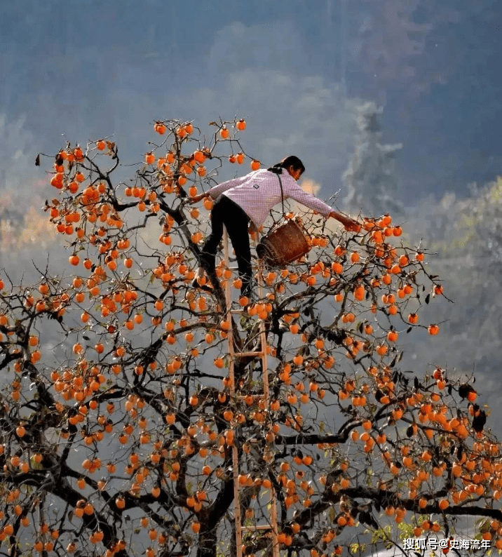 高高的柿子树顶,一个女人站在竹梯之上,腰上挎着竹篓。她身着蓝衣,头戴草帽,如同一幅油画中走出的女神,在柿子树下尽享田园风光。