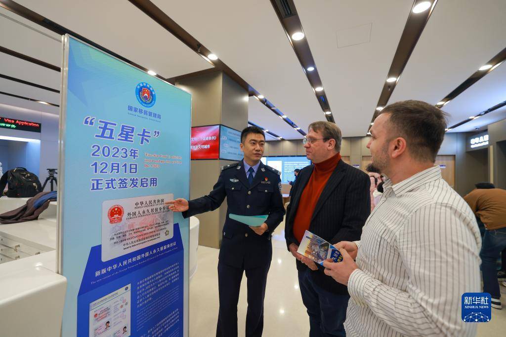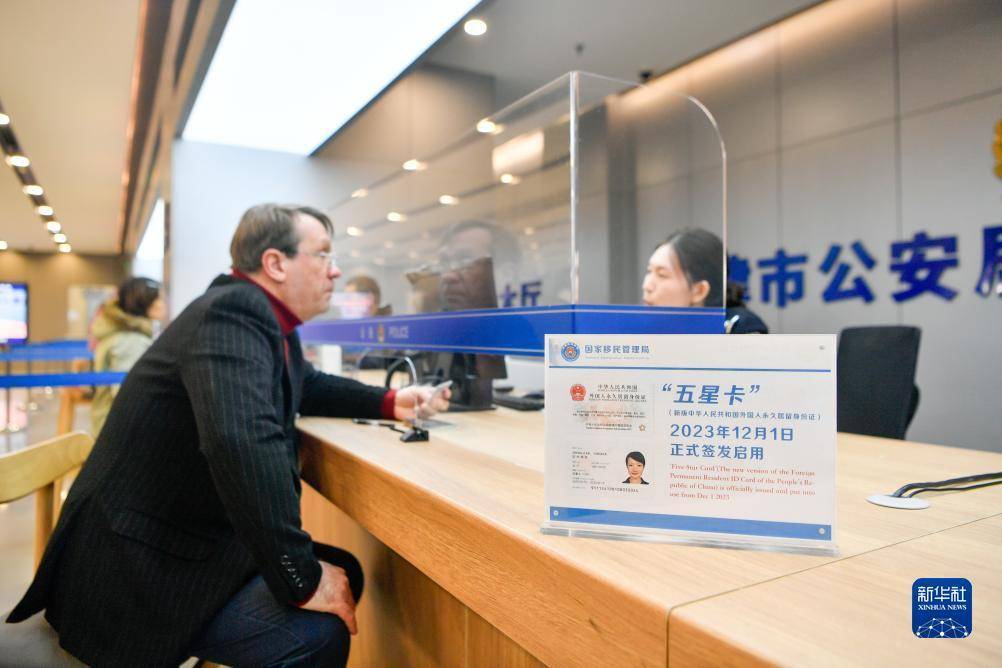12月1日,外籍人士在天津市公安局出入境管理局申办领取“五星卡”。