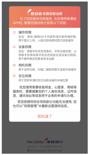 12月1日,记者在苹果手机应用商店下载了“泰惠收”(版本1.9.3,两个月前更新),在权限获取说明相关页面,该APP显示,需授权获得的权限包括“储存权限、设备权限、相机权限、定位权限”四大类。