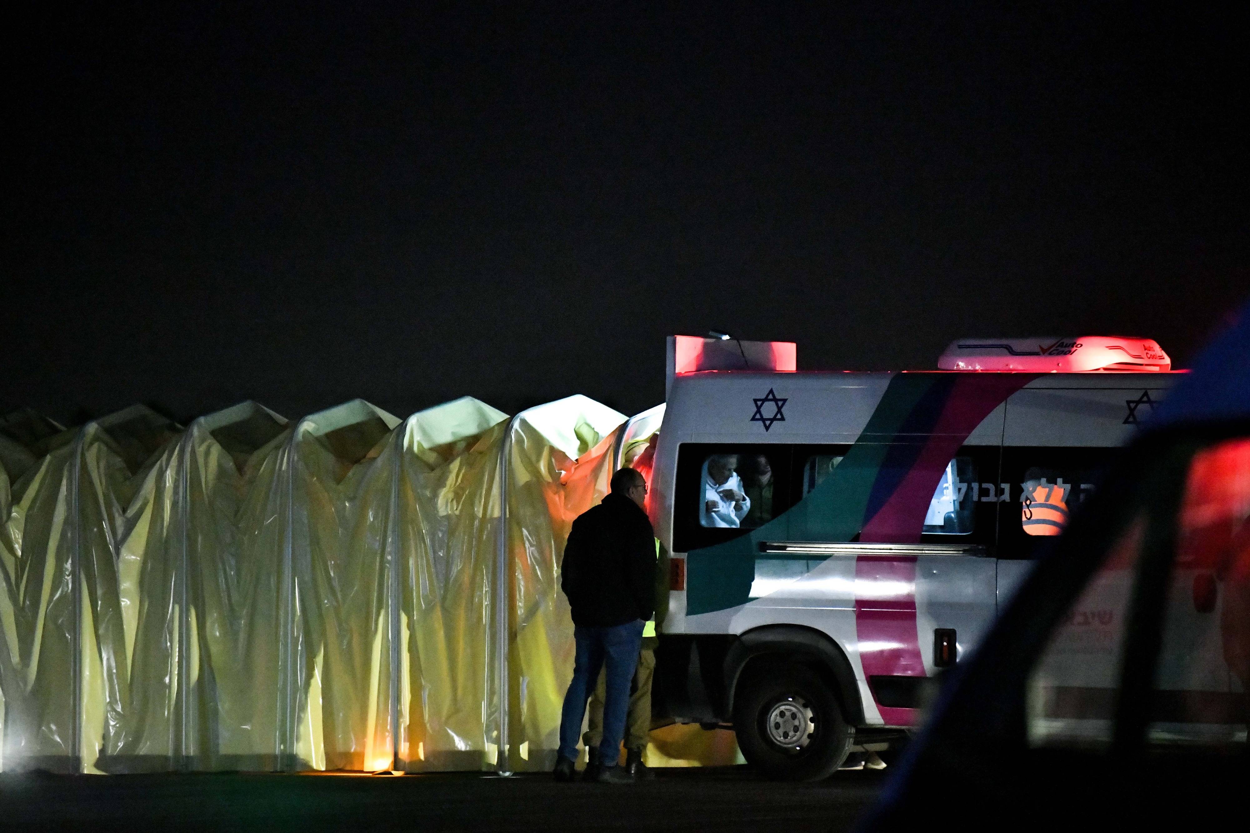 11月29日凌晨,获释的第五批被扣押人员搭乘直升机抵达以色列拉马特甘的一所医院。以色列军方11月28日宣布,已接收巴勒斯坦武装组织释放的第五批共12名被扣押人员。巴勒斯坦电视台同日报道说,以色列当晚释放了30名被关押的巴勒斯坦人。新华社/基尼图片社