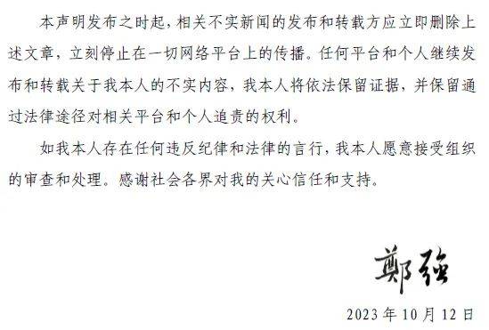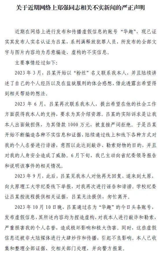 10月12日中午,郑强教授通过个人微信公众号发布声明:近期在网络上进行发布和传播虚假信息的账号“华趣”,现已证实其发布人实名认证为吕某,系刑满释放犯罪人员,所发布的全部文字与图片内容均为恶意编造、虚构的不实信息。