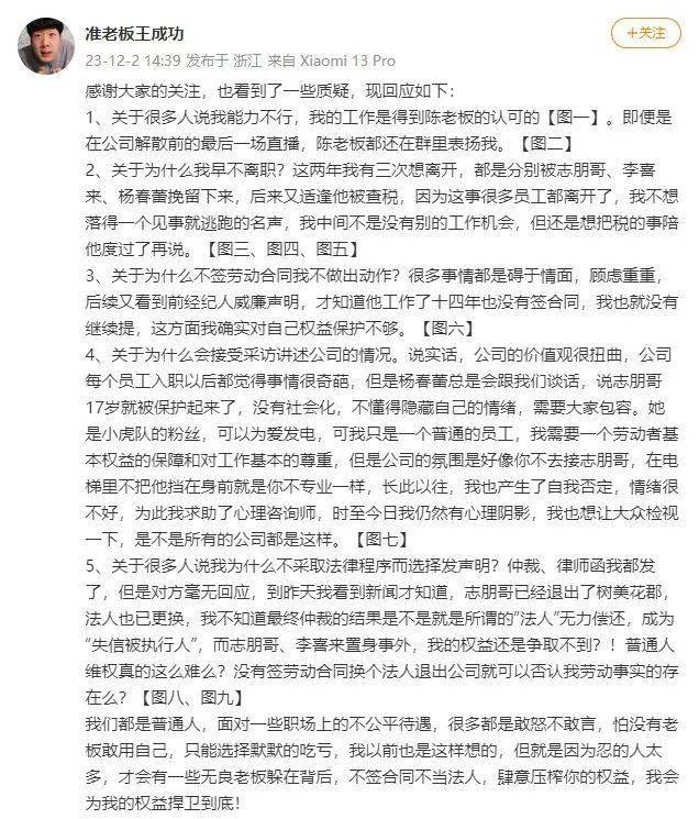12月2日@准老板王成功就网友质疑发文回应,称自己“碍于情面、顾虑重重”导致未签定劳动合同,而公司价值观扭曲,似乎不追捧陈志朋就是不专业的表现,因此自己工作期间出现了心理问题。
