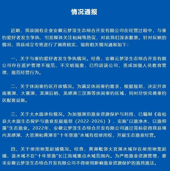 红星新闻记者注意到,11月30日下午,宿松县政府再次发布《情况通报》并致歉。该通报称,近期,该县国有企业安徽云梦泽生态综合开发有限公司在经营过程中,与垂钓爱好者发生争执,引发媒体关注和网络热议,对此深表歉意。针对反映的情况,该县成立专班进行了调查核实,经查,安徽云梦泽生态综合开发有限公司存在巡护管理不规范、不文明现象,已约谈该公司,责成加强人员教育管理,规范经营行为;为满足休闲垂钓需求,根据规划,决定开放南赛湖、大赛湖、龙湖后梢、龙感湖三汊港等休闲垂钓区域,同时尽快完善垂钓区配套设施。