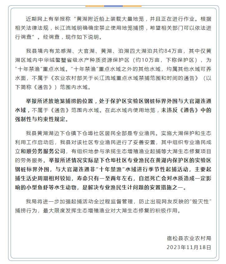 11月18日,宿松融媒曾发布关于“黄湖区域大规模使用地笼捕捞”举报情况的说明。宿松县农业农村局在情况说明中称,举报所述放地笼捕捞的位置,处于保护区实验区钢桩标界外围与大官湖连通水域,不属于《农业农村部关于长江流域重点水域禁捕范围和时间的通告》范围内水域。在此水域内使用地笼,未违反《通告》中强制性与约束性规定。