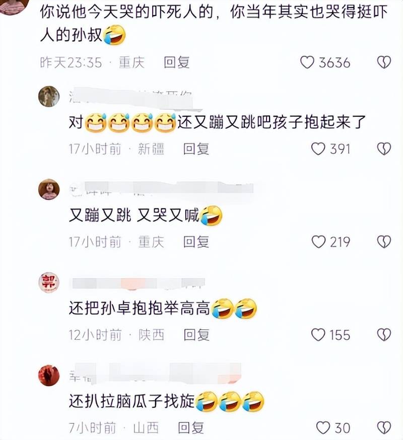 孙海洋还吐槽解爸爸找到儿子以后哭得很丑,网友成了解爸爸的嘴替:孙叔,你当时哭得也很吓人。看到孙卓时不光大哭大喊,把儿子搂在怀里,还不让孙卓妈妈抱,甚至还来回扒拉孙卓的头确认是否有“旋”。