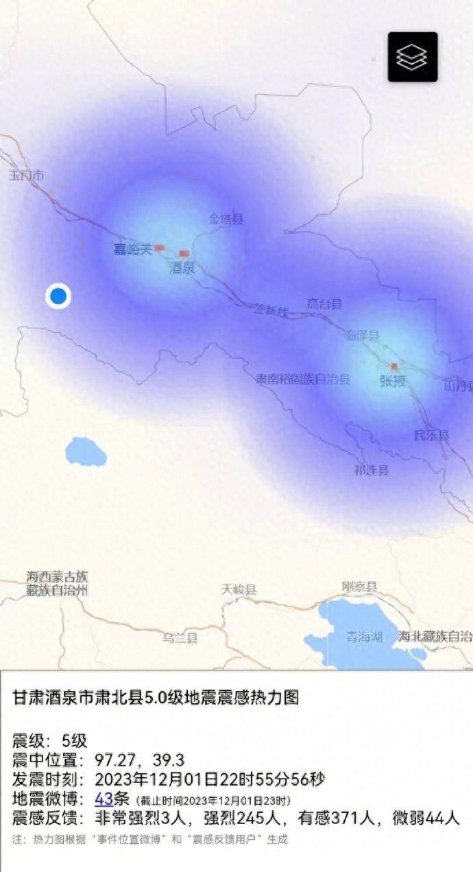 中国地震台网正式测定:12月01日22时55分在甘肃酒泉市肃北县(北纬39.30度,东经97.27度)发生5.0级地震,震源深度9千米。此次5.0级地震造成嘉峪关、酒泉、张掖等地震感强烈。