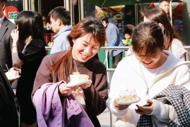 温馨的气氛弥漫着整个现场,工作人员们将美味的蛋糕依次分享给现场的顾客,彼此感受浓浓的甜蜜……