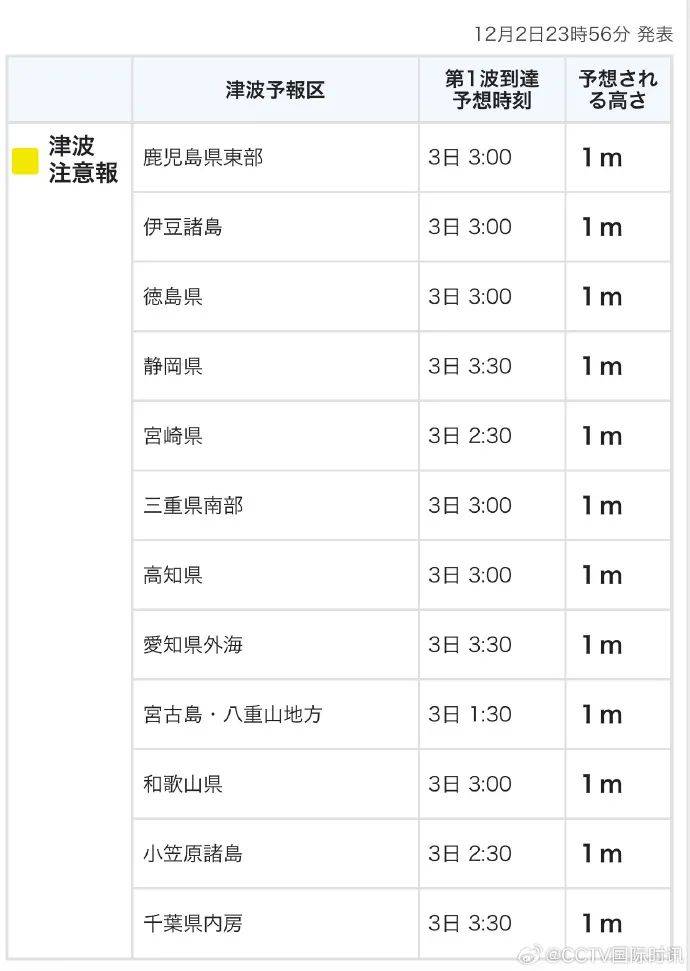 受菲律宾近海强震影响,日本气象厅于当地时间12月2日晚上11点56分(北京时间晚上10点56分)发布海啸预警,警报覆盖范围自日本本州岛千叶县向西一直延伸至冲绳县宮古岛·八重山地区。预计海啸在日本时间3日凌晨1点30分(北京时间零点30分)首先到达冲绳县宫古岛等地区,随后陆续到达其他地区。目前预计各地最大海啸高度均为1米。