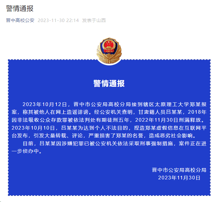2023年10月12日,晋中市公安局高校分局接到辖区太原理工大学郑某报案,称其被他人在网上造谣诽谤。