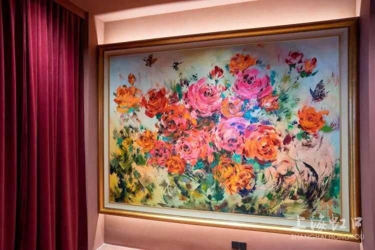 分中心以温暖、优雅的橡皮红为主色调,让人仿佛身处在画廊之中。门口左手边的巨幅油画《世纪玫瑰图》是著名油画家刘令华2001年为迎接APEC特别绘制的作品。画面上,21朵玫瑰象征21世纪21个国家举行的世纪盛会。悬挂在婚登中心,又赋予了画作更浪漫的寓意,为每一对收获爱情的新人送上新世纪的祝福,祝贺他们开启无限美好的玫瑰人生。