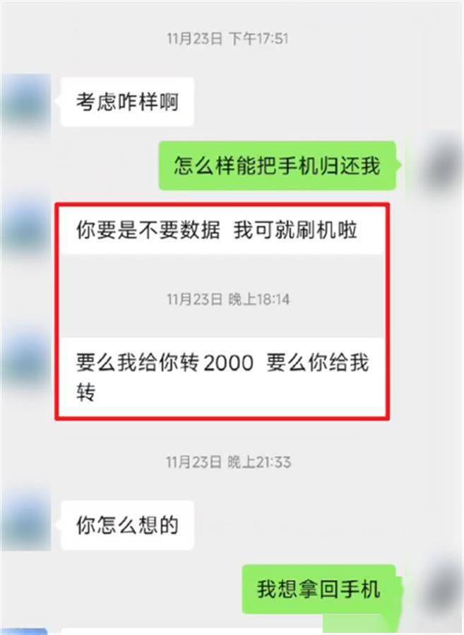 “我还是个学生,没有那么多钱。”张同学反复请求男子归还手机,但男子坚持要价2000元,其间甚至威胁如果不给钱就刷机。