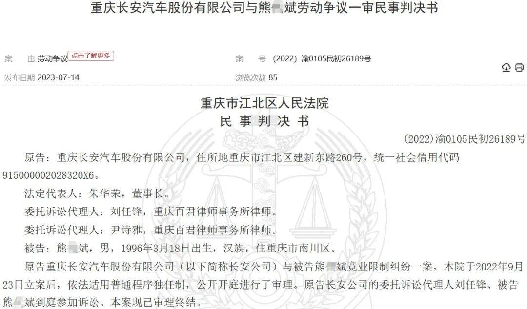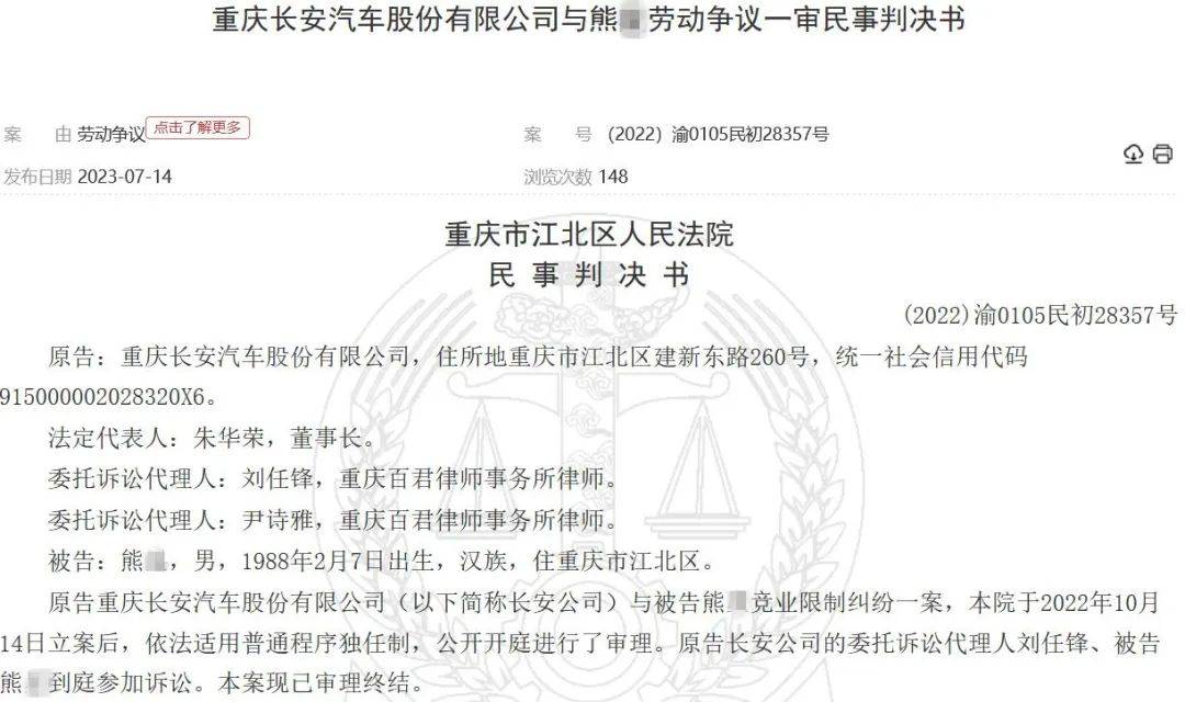 2023年7月14日,中国裁判文书网刊登了《重庆长安汽车股份有限公司与熊某劳动争议一审民事判决书》【案号:(2022)渝0105民初28357号】。