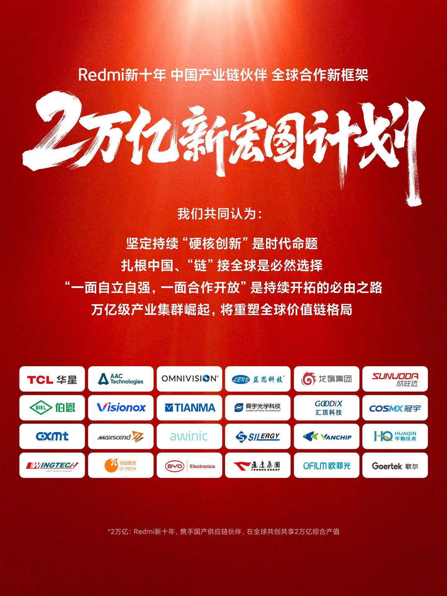 前段时间,为了可以继续推动国产供应链的全面发展,由Redmi牵头,还跟比亚迪、华星光电、天马微电子、瑞声科技等企业达成了“清河共识”。这项技术会在未来的十年共创2万亿的综合产值,并推动国产供应链从追赶到引领。