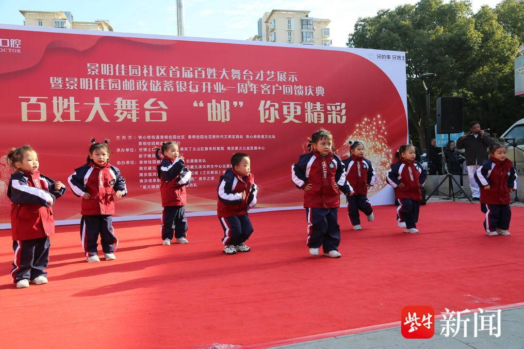 扬子晚报网 12月2日讯 (李正红 林厚彬 郑幼明 文/摄)“绽放你的精彩,秀出你的才艺”。2日上午,“景明佳园社区首届百姓大舞台才艺展示”,在南京雨花台区景明佳园社区红旗广场盛大举办。这场主题为“百姓大舞台 ‘邮’你更精彩”大赛的初赛,历时三个多小时,共有近三十个节目参赛,选手中最大的近80岁,最小的才4岁,选手中还有中外组合的小朋友现场演绎。