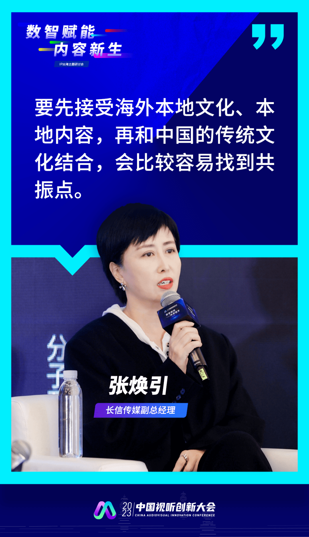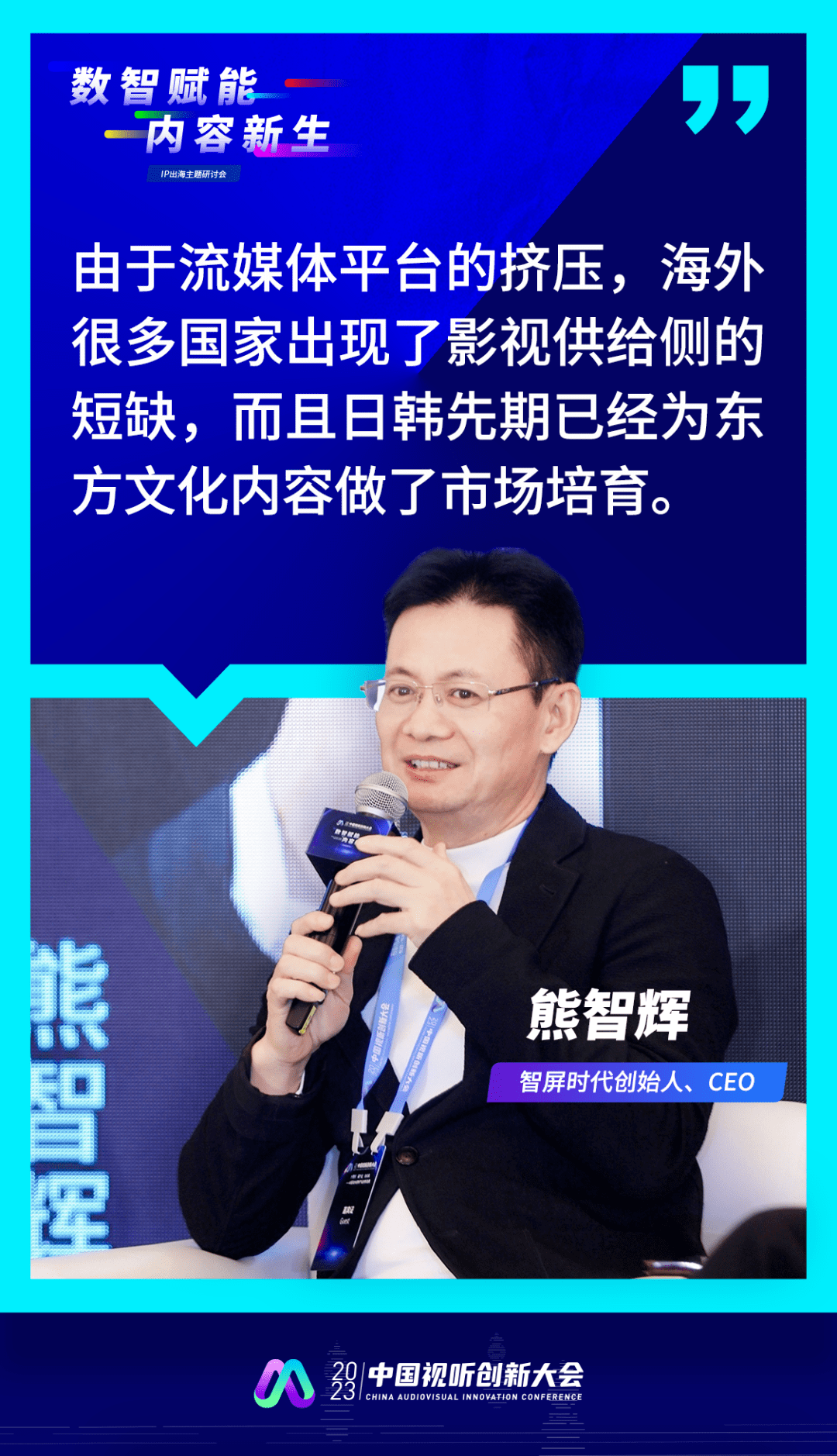 在2023年中国视听创新大会,由新声Pro协办的IP出海主题研讨会上,长信传媒副总经理张焕引,分子互动创始人徐博,智屏时代创始人熊智辉,以及九州文化海外业务负责人刘金龙,围绕内容出海的路径和机遇,进行了圆桌讨论。