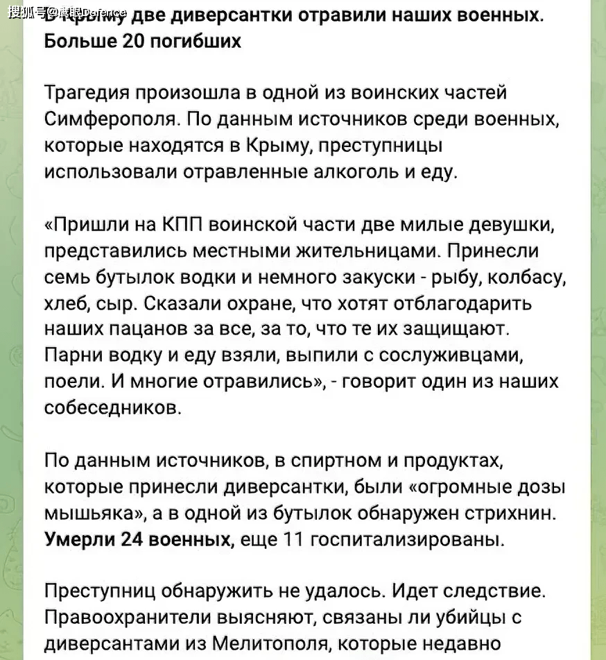 此外,“电报”频道“Kremlevskaya tabakerka”援引军方消息来源称,在俄军占领的克里米亚首府辛菲罗波尔再次发生了一次投毒事件,24名俄军士兵中毒身亡,“两个可爱的女孩来到检查站......她们告诉卫兵,她们要感谢我们的男孩所做的一切,感谢他们保护他们......”。女孩们带来了7瓶伏特加和一些食物,包括奶酪、面包、香肠和鱼,事后查明这些伏特加和食物里有“大量砷”,其中一瓶酒里还发现了马钱子碱,士兵们在吃了食物喝了酒后,24人“归零”,11人被紧急送院治疗,两个女孩下落不明。