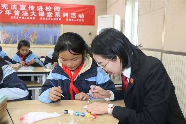 揭牌仪式结束后,市少儿图书馆向希望小学阅读点赠送了图书及冬日暖阳慰问品。随后盱眙县法院的法官们为同学们上了一堂以“学宪法讲宪法 争做宪法小卫士”为主题的法治教育课,并为孩子们送上《漫画民法典》《漫画生物多样性保护》等普法图书;市少儿图书馆的工作人员带领同学们制作了精致的“宪法”手工挂件,引导学生主动学习法律法规、规范自己的言行、树立法治观念。