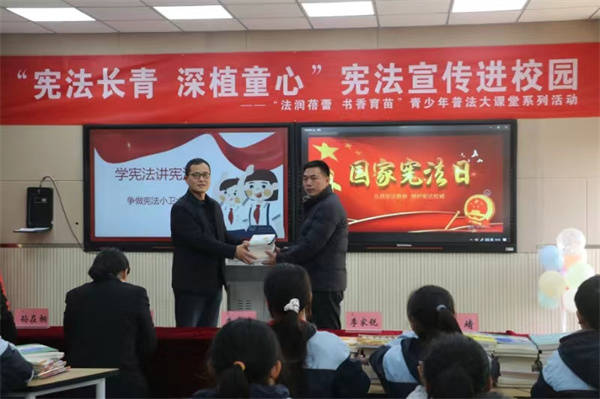 为深入贯彻落实全国、省妇女儿童工作会议精神,丰富“法润蓓蕾 书香育苗”青少年普法大课堂品牌系列活动的形式,精心打造“普法+阅读”新模式,进一步丰富乡镇少年儿童精神文化生活,在国际宪法日来临之际,淮安市法院和淮安市少儿图书馆在盱眙县希望小学联合建立全市首个“法润蓓蕾 书香育苗”青少年普法阅读点。