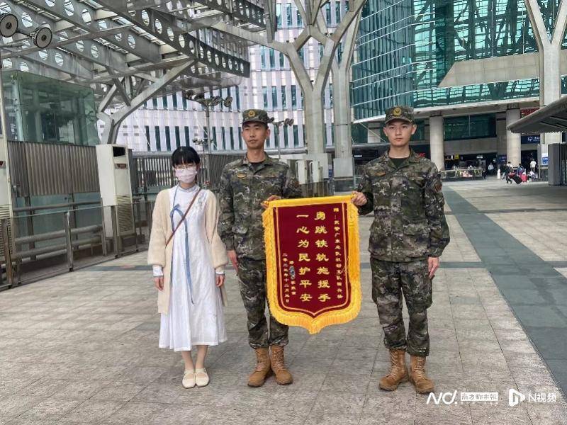 南都讯 记者何生廷 通讯员胡福建 12月3日,在广州东站,家属陆小姐将一面锦旗“勇跳铁轨施援手 一心为民护平安”送到武警战士田兴壮的手上,表达自己的谢意。