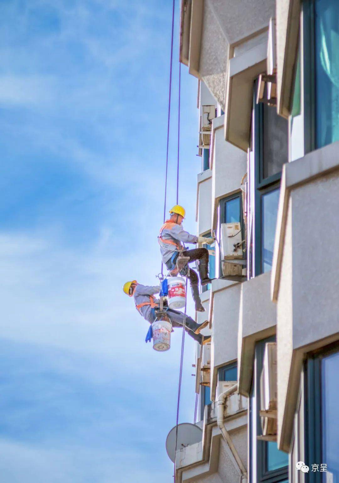 朝阳区将台西路芳园里,工人们正在忙着为高楼 “刷身洗脸”,守护美丽家园。刘玉松 摄