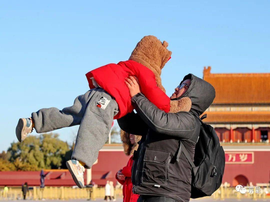 父子俩不惧寒冷,在天安门广场上快乐嬉戏,享受幸福瞬间。王新 摄