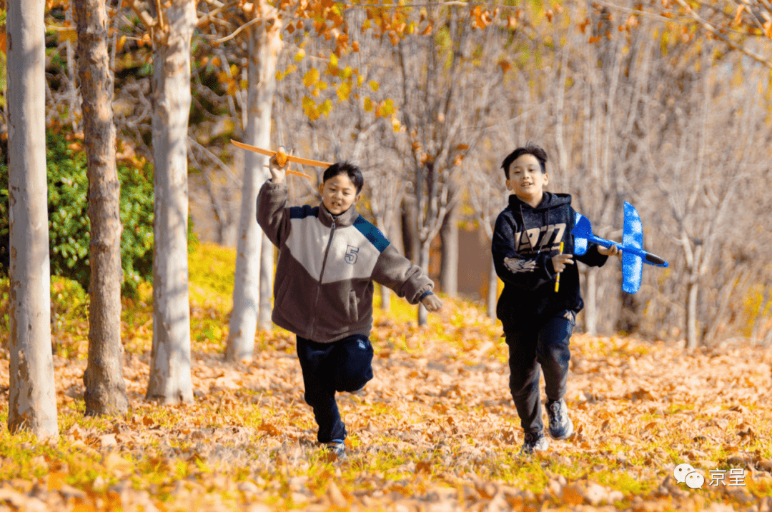 郊野山林间,两个孩子在金黄色的落叶铺成的地毯上奔跑,享受快乐。金建军 摄