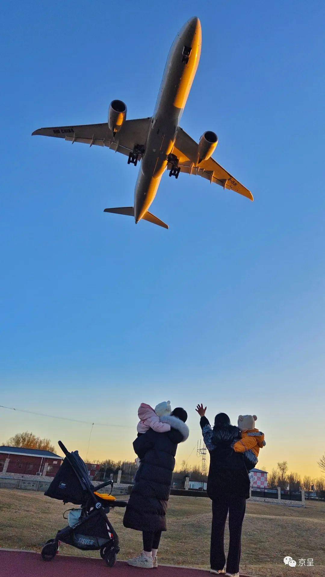 夕阳照耀着大地,给人们带来温暖和希望。首都机场,一家人正向着大飞机快乐招手。柳峰 摄
