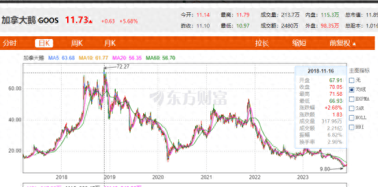 上市首日,其股价大涨27.2%至16.25美元。在经历小幅下落后,加拿大鹅股价一路飙升,在2018年11月下旬达到峰值。2018年11月16日,加拿大鹅收盘价为70.05美元/股,市值达76.83亿美元。