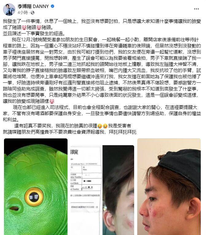 李博翔12月3日发文回应此事,称自己被打成猪头脸,指当晚不小心弄到轿车的后视镜,没想到被车主连骂带踹,拳打李博翔的脑袋和脸部,直接导致破相。