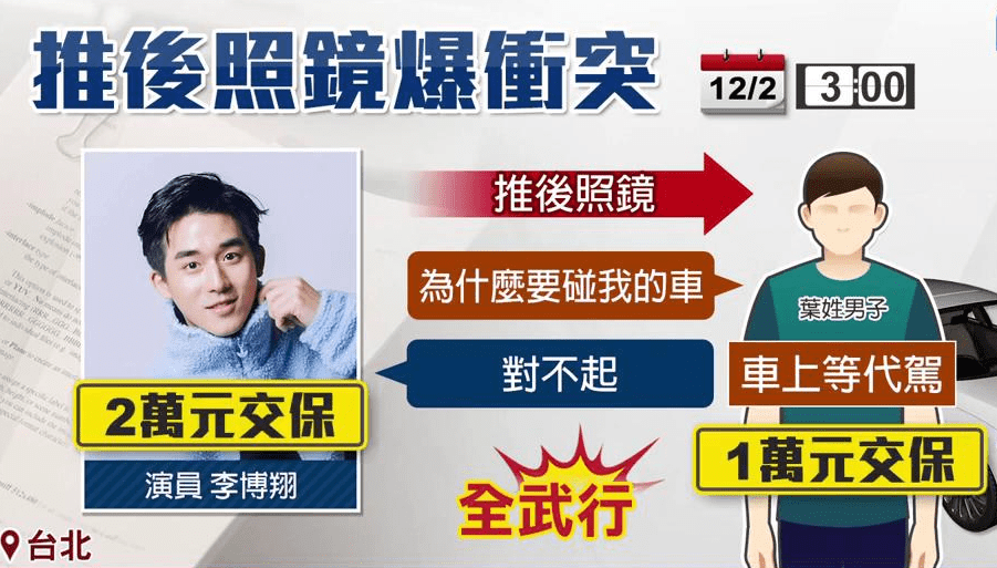 据台媒12月3日报道,34岁男星李博翔与歌手女友王欣晨在街头被打,他们和29岁的叶姓男子发生肢体冲突,最终两人依涉嫌伤害罪移送台北地检署,李博翔缴纳2万台币保释,而叶某则缴纳1万台币。