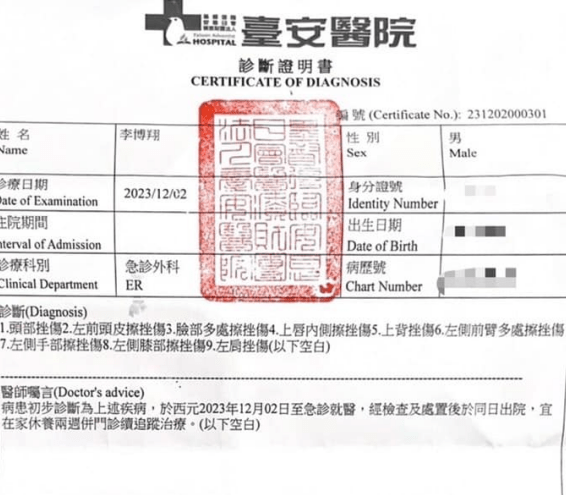 医院诊断报告指出,李博翔身上九处受伤,不过无需住院。