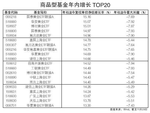 具体来看,商品型基金中今年涨幅最大的是国泰黄金ETF联接A,年内净值增长了15.16%,此外,华安黄金ETF、博时黄金ETF的年内涨幅也均超过15%(见表),相比而言,主动权益型基金中的前海开源金银珠宝虽然也投资贵金属,该基金年内涨幅达到10%,但最大回撤也达到18%。