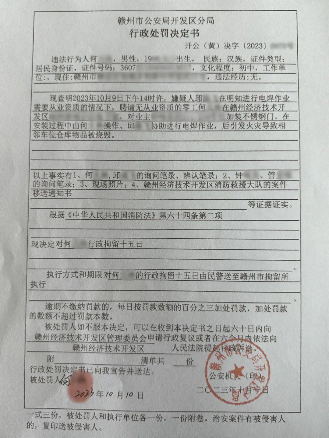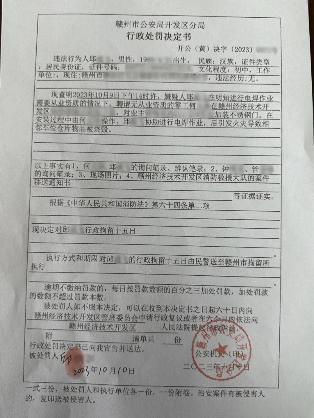 因违规电焊引发火灾被拘留
