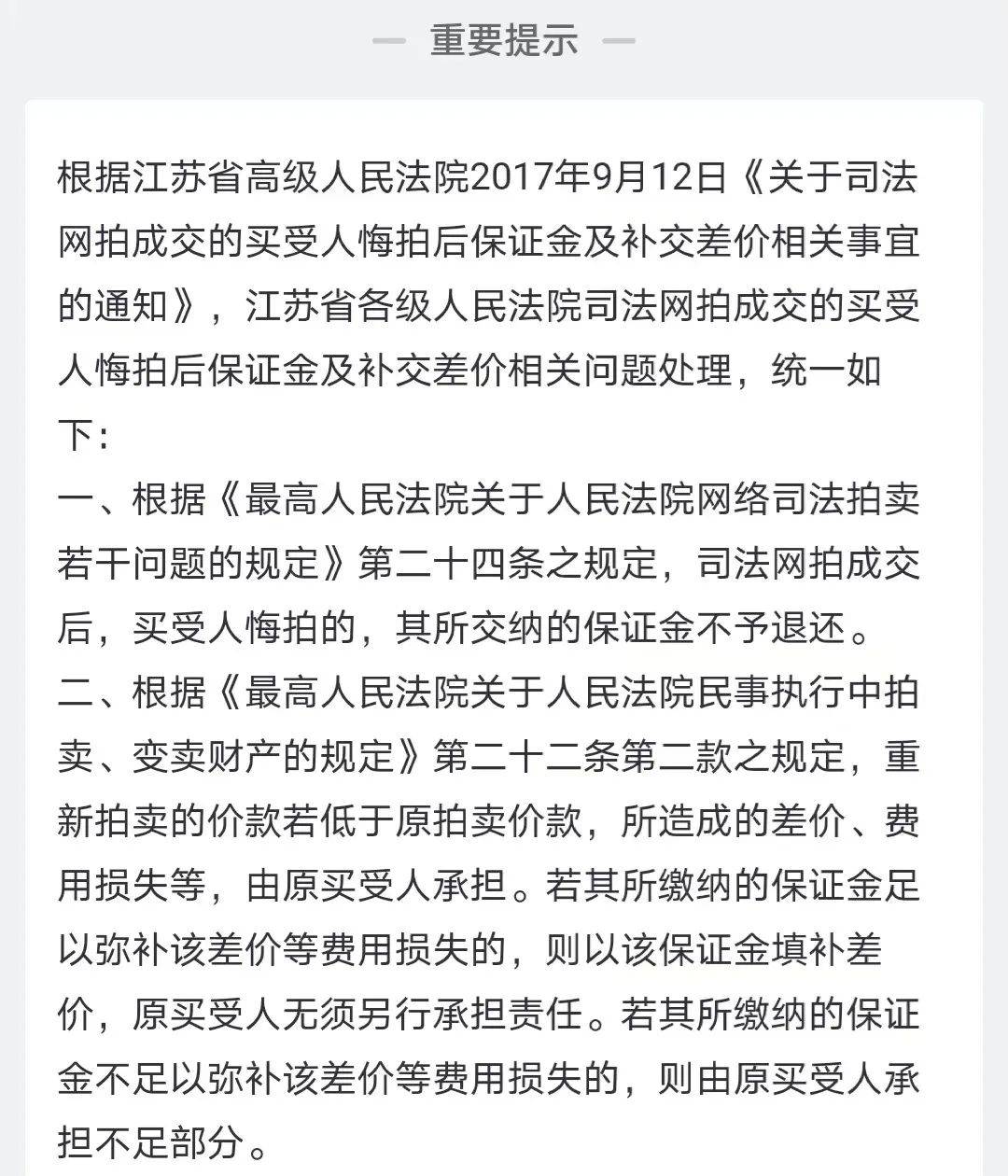 公告中也明确注明:司法网拍成交后,买受人悔拍的,其所缴纳的保证金不予退还。此外,重新拍卖的价款若低于原拍卖价款,所造成的差价、费用损失等由原买受人承担。若其所缴纳的保证金足以弥补该差价费用损失的,则以该保证金填补差价,原买受人无须另行承担责任。若其所缴纳的保证金不足以弥补该差价等费用损失的,则由原买受人承担不足部分。