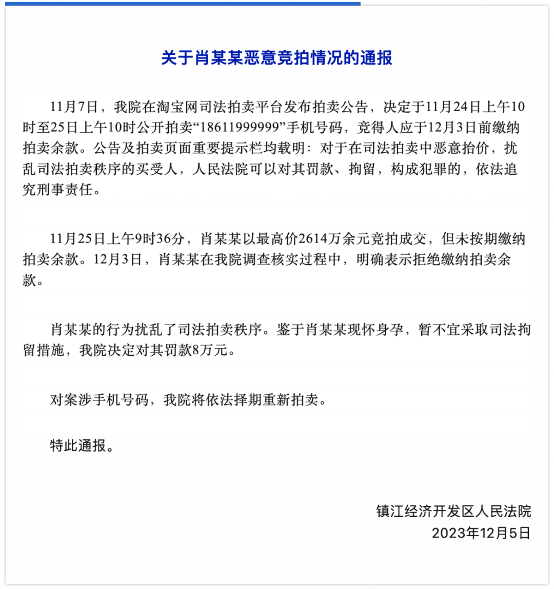 12月5日,江苏镇江经济开发区人民法院通报称,11月25日上午9时36分,肖某某以最高价2614万余元竞拍成交手机号码“18611999999”,但未按期缴纳拍卖余款。12月3日,肖某某在法院调查核实过程中,明确表示拒绝缴纳拍卖余款。