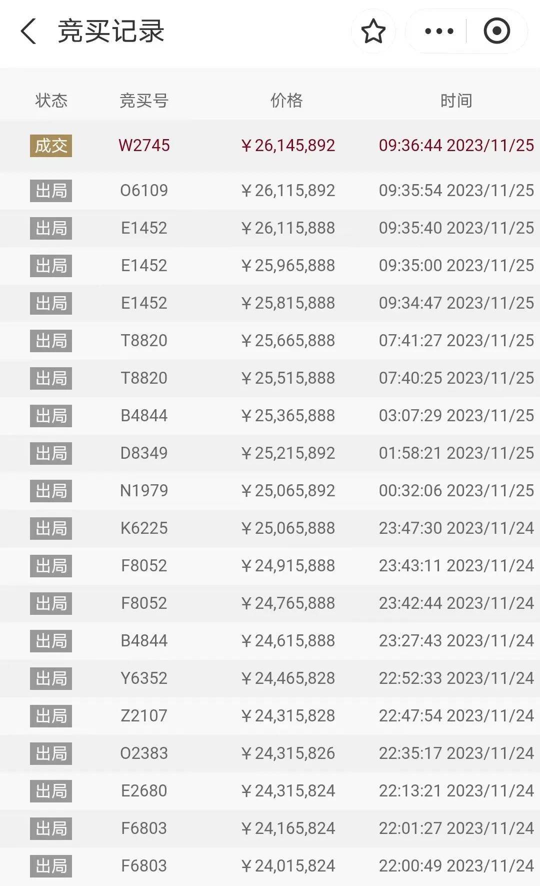 11月25日上午10时,本场法拍结束,一买家以最高价26145892元竞得这一手机号码,比起拍价暴增了26万倍。网络竞价成功确认书显示,竞买者是一位姓肖的自然人。