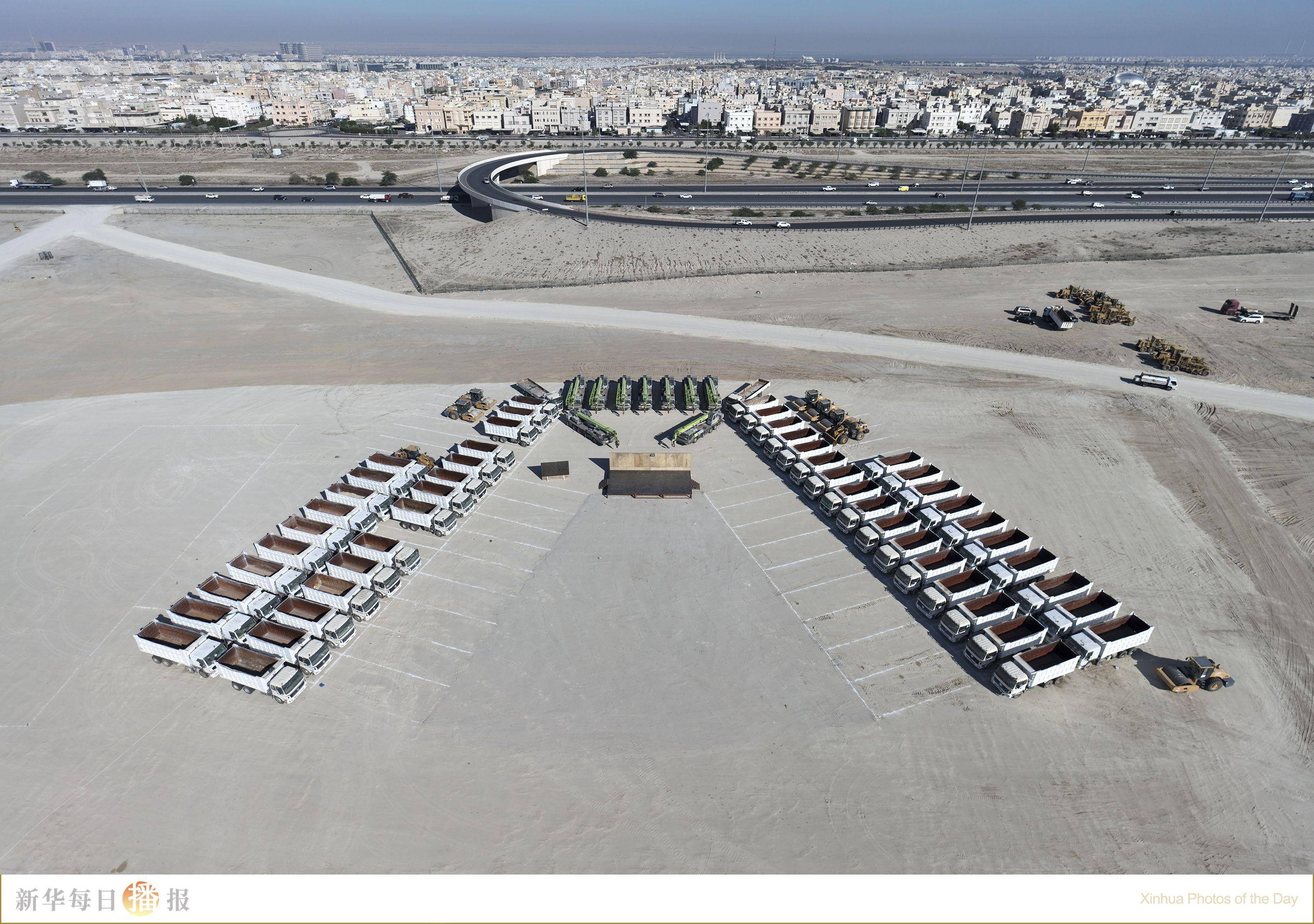 12月4日,在科威特杰赫拉省南萨阿德阿卜杜拉新城基础设施项目施工现场拍摄的工程机械设备(无人机照片)。中国能建葛洲坝集团承建的科威特南萨阿德阿卜杜拉新城基础设施项目当日在科威特杰赫拉省正式开工。该项目包括2万余套住房和配套基础服务设施的建设,建成后可满足至少15万人的住房需求。