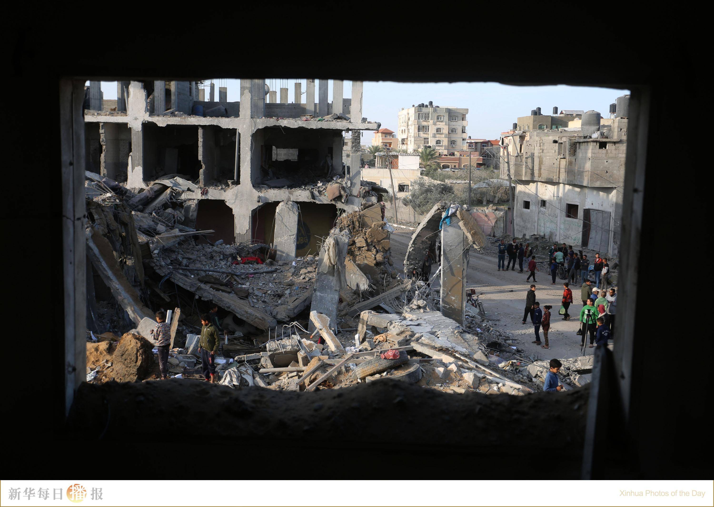 12月4日,在加沙地带南部城市拉法,人们查看以军空袭后的住宅废墟。巴勒斯坦消息人士4日告诉新华社记者,以军3日夜间空袭了拉法的一处住宅,造成至少11人死亡。加沙地带卫生部门4日发表声明说,自10月7日巴以新一轮冲突爆发以来,以军在加沙地带的军事行动已造成15899名巴勒斯坦人死亡、4.2万余人受伤。