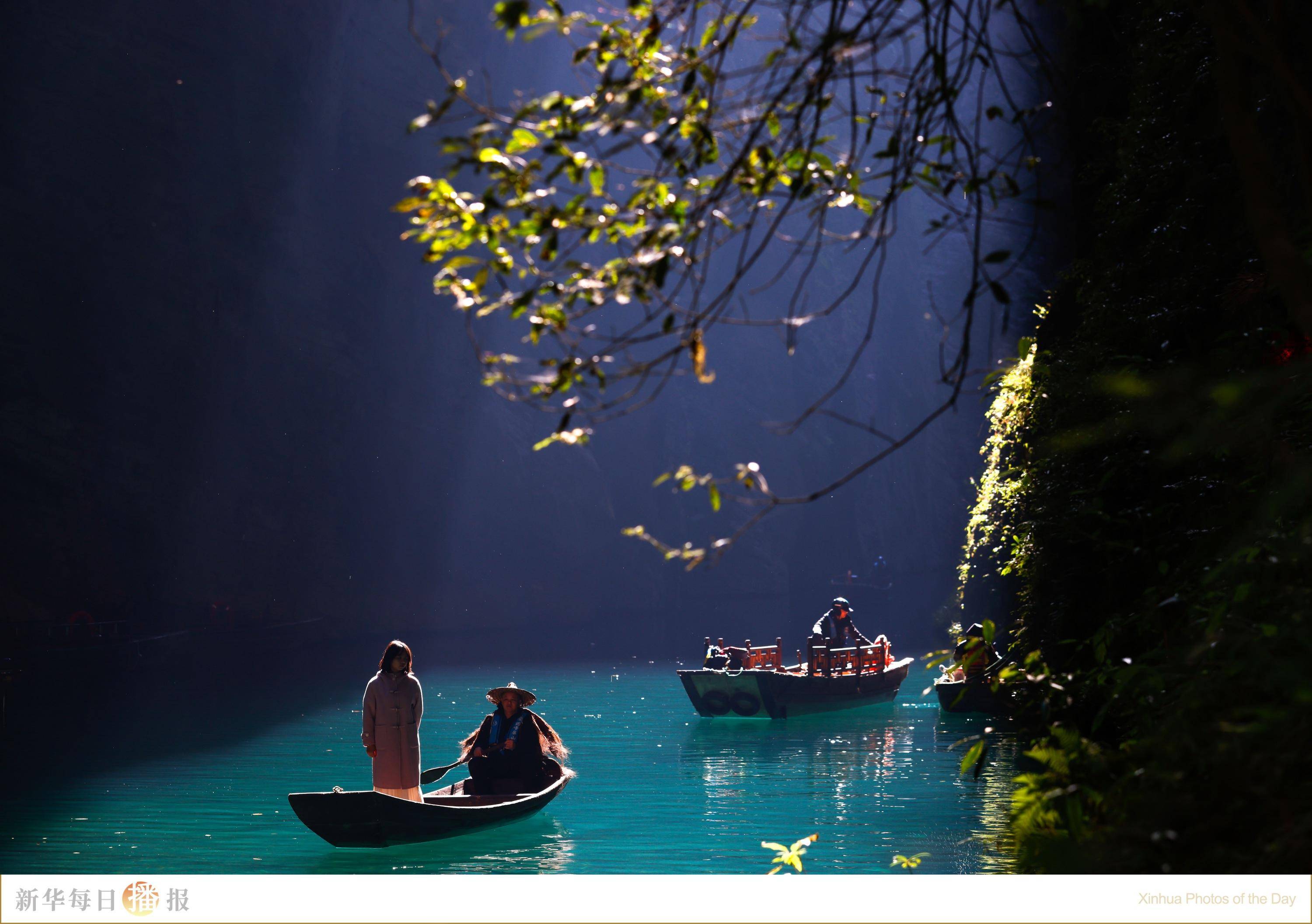 12月4日,游客在鹤峰县容美镇屏山峡谷乘船观光。位于湖北省恩施土家族苗族自治州鹤峰县容美镇的屏山峡谷,绝壁耸峙,碧水潺潺,“一线天”景观绵延十几公里,形成罕见的峡谷景观。此处碧水、轻舟与绝壁、森林相映成趣,每年吸引众多游客前来观光。