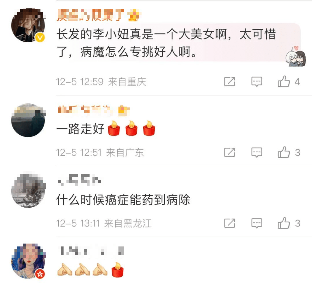 今年4月,李小妞的病情急转直下,她的肺癌转移到了脑膜,被迫辗转多地治疗。最终李小妞在12月1日去世,留下两个未成年的儿子,其中小儿子才3岁。12月2日,李小妞老公晒出李小妞在医院抢救的视频,再一次表达痛惜:“李小妞离开了我们,对不起,这一次我没有把她留住,从此你长眠我常念”。